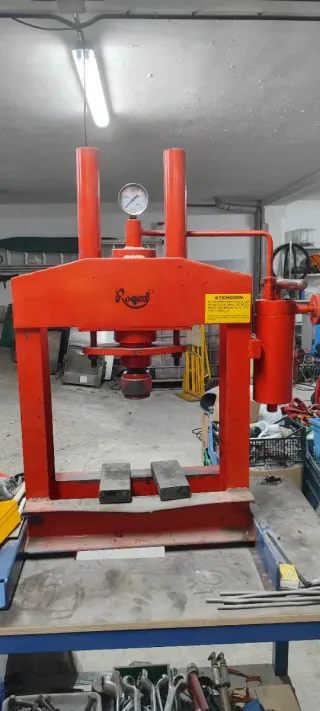 Prensa hidráulica manual de la marca Rogén, ideal para talleres y reparaciones. - Estructura robusta de color rojo. - Manómetro para control de presión. - Incluye placa de advertencia 'ATENCION'. - Base con soportes para piezas. -Capacidas 20.000kg/20 toneladas