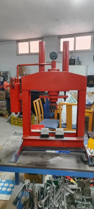 Prensa manual para taller, ideal para trabajos de presión y conformado. - Estructura robusta de metal. - Palanca de operación. - Base estable para montaje.