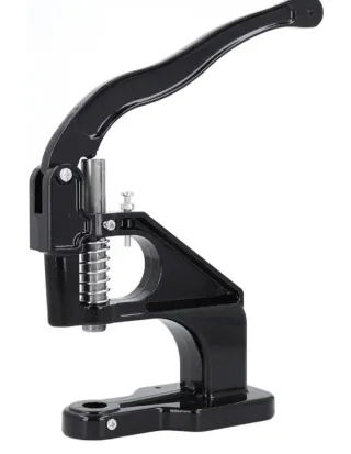 Prensa remachadora utilizada para colocar ojales, botones a presión o remaches. - Construcción robusta de metal negro. - Incluye palanca de acción. - Diseño compacto para fácil manejo.