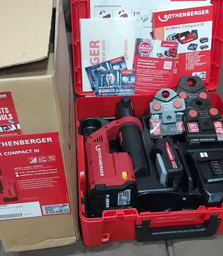 No hago envios y no negociable . Precio fijo . Total mente nueva sin uso solose entrega en mano Herramienta de prensado electrohidráulico ROTHENBERGER ROMAX Compact III. - Incluye juego de mordazas RFz16, RFz20 y RFz25. - Sistema CAS (Cordless Alliance System) compatible con baterías AMPShare de Metabo - Maletín de transporte rojo. - Manual de instrucciones y accesorios.