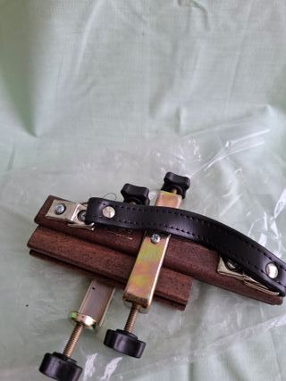 Prensa de sujeción de madera con detalles metálicos y correa de cuero. - Construcción robusta de madera. - Mecanismo de sujeción ajustable. - Correa de cuero para un agarre cómodo.