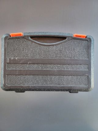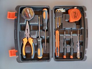 Maletín de herramientas compacto y práctico. - Incluye alicates, destornilladores, cúter, cinta métrica y llaves Allen. - Diseño en color negro con detalles naranjas.