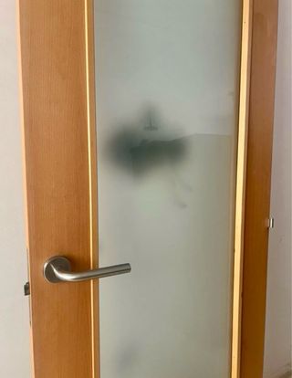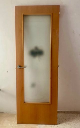 Puerta interior de madera en color miel con cristal translúcido, prácticamente nueva. - Cristal esmerilado. - Manilla de acero inoxidable. - Ideal para cualquier estancia del hogar.
