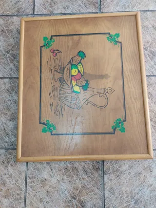 Precioso azulejo antiguo con una escena de tres personas caminando en un paisaje. - Marco de madera incluido. - Diseño colorido y detallado. - Ideal para coleccionistas o decoración.