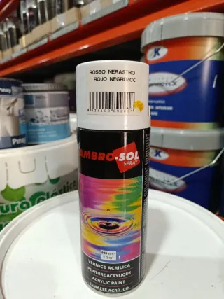 Spray de pintura acrílica de la marca Ambro-Sol. - Color: Rosso Nerastro / Rojo Negruzco. - Contenido: 400 ml. - Rendimiento: ± 2 m². - Tipo: Barniz acrílico. EN OFERTA HASTA FIN DE EXISTENCIA.