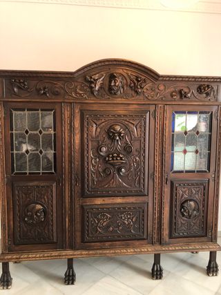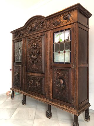 mueble de estilo Renacimiento / Neorrenacentista, muy popular a finales del siglo XIX y principios del XX (aprox. 1880–1920). Las pistas clave son: • Madera maciza (probablemente nogal o roble) • Talla muy abundante y profunda, con motivos vegetales y caras humanas • Puertas con paneles tallados en relieve • Vidrieras emplomadas con detalles de color (muy típicas del historicismo) • Patas tipo garra, otro rasgo clásico de la época Este tipo de mueble solía usarse como aparador, alacena o vitrina en comedores elegantes