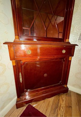 Mueble esquinero antiguo de madera y cristal