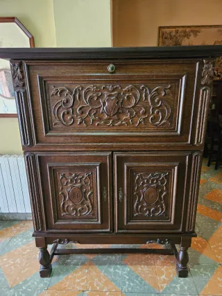 Mueble de comedor antiguo con detalles de madera tallada y superficie de cristal. - Diseño clásico y elegante. - Amplio espacio de almacenamiento con puertas y cajones. - Patas ornamentadas. Pieza de madera noble con gran potencial estructural, ideal para entusiastas de la restauración. Presenta marcas de uso y necesidad de un proceso de saneamiento técnico y tratamiento preventivo de xilófagos, permitiendo recuperar su esplendor original mediante una puesta a punto estética. Una excelente oportunidad de inversión por su calidad base y precio reducido