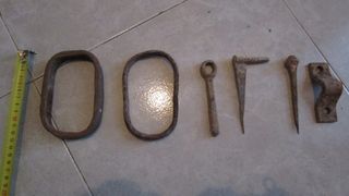Conjunto de herrajes antiguos de forja, ideales para proyectos de restauración o decoración. Las argollas eran las que se usaban para sujetar el madero a la puerta que tuviera rotación al abrir. - Dos anillas ovaladas de hierro. - Un pasador con argolla. - Una escuadra de forja. - Un clavo de forja. - Una pieza de sujeción metálica.
