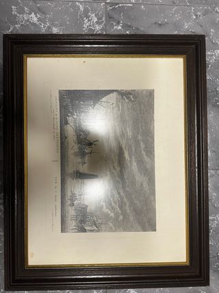 Antiguo grabado que representa una vista del puerto de Ámsterdam. - Gezicht in & Oude Jagthaven - Vue de y d'Amsteldam - Marco de madera oscuro. • “Grabado antiguo” • “Marco clásico de madera” • “Ideal decoración vintage”