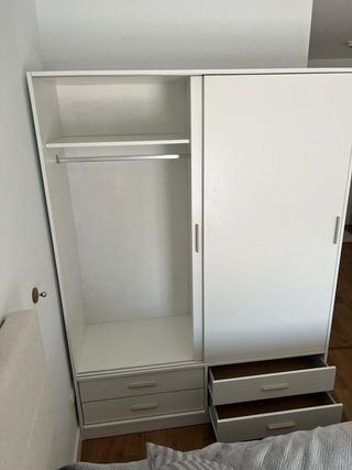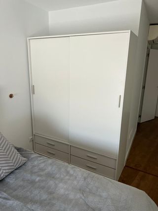 Armario de puertas correderas en color blanco. Cuenta con espacio de almacenaje y cajones. - Puertas correderas. - Compartimento con barra para colgar. - Estantes. - Cajones inferiores.