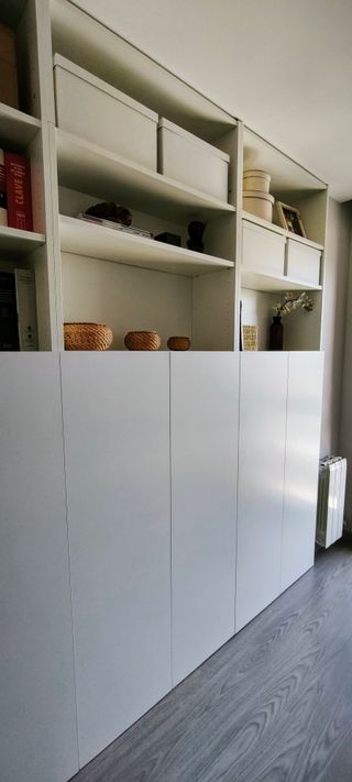 Mueble de almacenamiento con puertas correderas y baldas interiores. - Diseño moderno y funcional. - Acabado en color blanco. - Fabricado en materiales resistentes.
