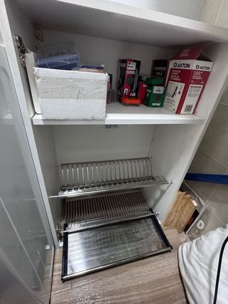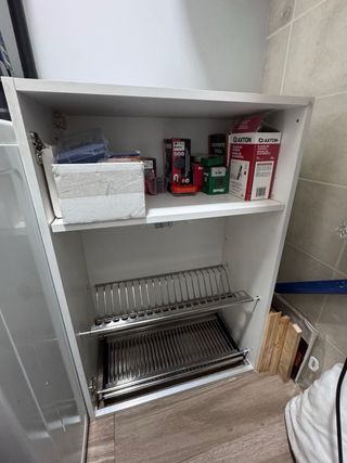Mueble alto con escurreplatos integrado en muy buen estado Sin golpes ni arañazos, con puertas y herrajes incluidos. Limpio y listos para instalar. • 60×33×90 cm con escurreplatos, color blanco — 69 € 📍 Recogida en mano
