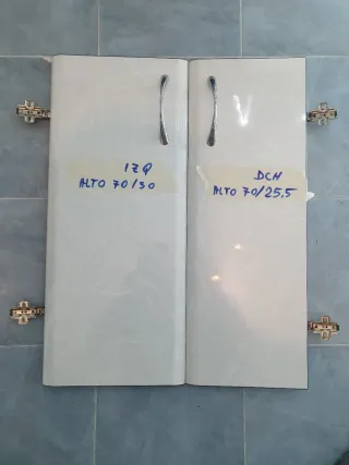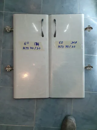 Varias puertas para muebles de cocina en acabado blanco gris . Puertas muebles altos 90 cm , puertas muebles bajos 70 cm - Tiradores metálicos plateados. - Medidas aproximadas: 70 cm de alto x 60 cm de ancho (cada puerta). - Incluyen bisagras. 15€ unidad,