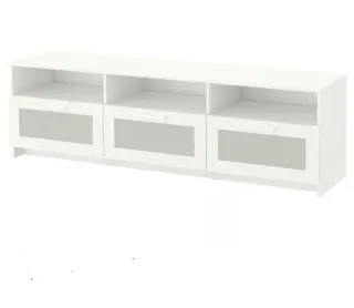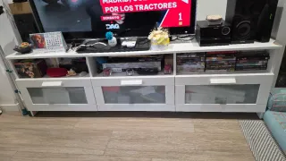 Mueble de televisión moderno y funcional, se entrega montado - Tres compartimentos superiores abiertos. - Tres puertas inferiores con paneles de cristal. - Tiradores integrados en las puertas.