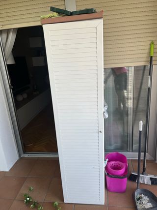 Armario /Botellero de madera con un diseño de lamas en la puerta. Se daria limpio 1,68m de largo 40 cm de ancho 40 cm de fondo - Color blanco. - Material de madera.