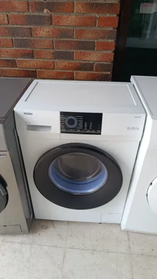 Lavadora frontal de la marca Haier en color blanco. Diseño moderno y elegante. - Panel de control digital. - Puerta frontal con acabado en negro. - Compartimento para detergente.