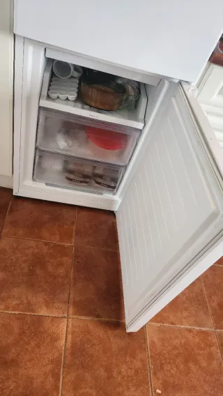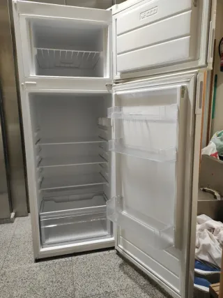 Frigorífico de color blanco, con diseño moderno y elegante. Prácticamente nuevo comprado en abril de 2025. En tienda cuesta 169,90€ - Puerta superior para congelador. - Amplio espacio interior.