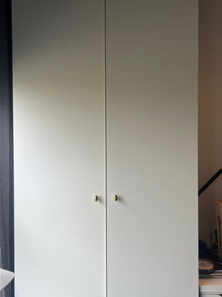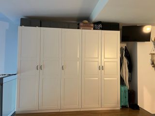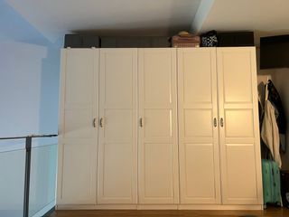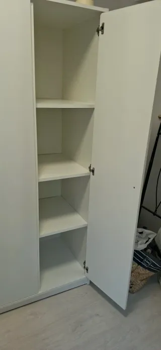 Armario de dormitorio modelo PAX en color blanco. Un mueble de almacenamiento versátil y elegante. - Diseño de puertas batientes. - Tiradores metálicos.