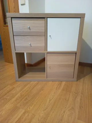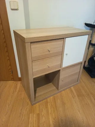 Mueble de almacenaje tipo cajonera de Ikea. - Combinación de cajones y compartimentos con puerta. - Acabado en madera clara y detalles en blanco.