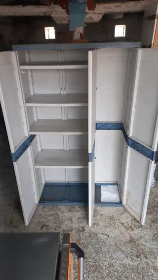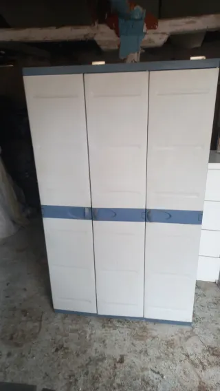 Armario de plástico con un diseño moderno y funcional. - Tres puertas. MEDIDAS 1,05 ancho, 1,75 alto ,40 fondo. - Tira decorativa en color azul. No NEGOCIABLE.