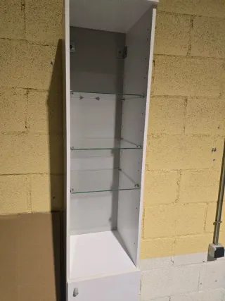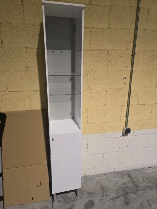 Armario alto de baño de IKEA, con un diseño moderno y funcional. - Estructura de color blanco. - Puerta inferior. - Estantes de cristal.