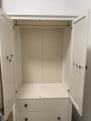 🆕 Armario nuevo a estrenar 🎨 Color: Blanco y madera 🚪 4 puertas frontales amplias 🧰 4 cajones alargados en la parte inferior 🖐️ Tiradores cómodos para fácil apertura 📏 Medidas: 80 x 190 x 50 cm ✨ Ideal para organizar ropa, accesorios y más 📍 Más info: *610, *275, *398*