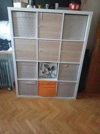 Estantería modular Kallax de Ikea, configuración 3x4. Incluye 4 puertas y 4 cajas de almacenaje. - Estructura de madera. - Color blanco. - Cuatro cajas de tela incluidas.