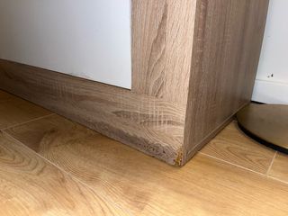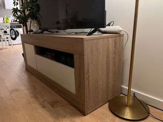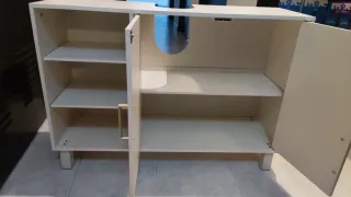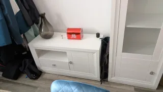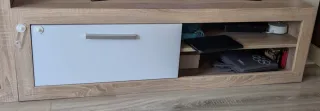 Mueble bajo ideal para TV o almacenamiento, de estilo moderno y líneas rectas. Combina acabado efecto madera clara con puertas blancas, lo que lo hace fácil de encajar en salones modernos o nórdicos. Cuenta con espacio cerrado y huecos abiertos, perfecto para consolas, decodificador, libros o decoración. 📏 Estado general: bueno y estructuralmente firme. 🐶 Defecto: en la parte inferior lateral (tal y como se ve en las fotos) tiene daños por pis de perro, con el material hinchado/desgastado en esa zona. Es solo estético y no afecta a la estabilidad del mueble. 💡 Opciones para arreglarlo fácilmente: Lijar la zona afectada y aplicar