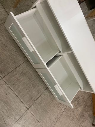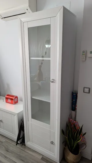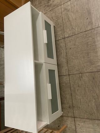 Conjunto de muebles Besta de Ikea, combinando acabados en blanco y madera. - 2 Puertas con cristal translúcido. - 2 Cajones con acabado liso brillante - 5 puertas acabado liso brillante. - Diseño moderno, funcional y mucha capacidad. - en perfecto estado. - quitada mitad de trasera en uno de ellos para radiador. Montado pero separado en 3 partes. Módulo superior 120*42*38, y 2 módulos altos 120*42*193. con las puertas y cajones en cristal o alto brillo blanco que aparecen en las fotos. Se entrega con todos los errajes.