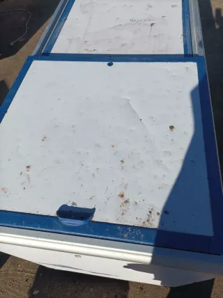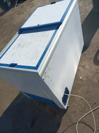 Congelador horizontal de gran capacidad, ideal para negocios o uso industrial. Su diseño blanco se adapta a cualquier entorno. - Exterior de color blanco. - Puerta superior con marco azul. - Rejilla de ventilación en la parte inferior.