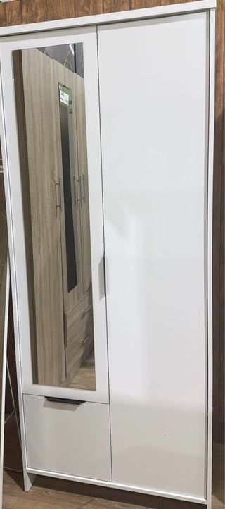 Armario de dos puertas con un diseño moderno y funcional. - Una puerta con acabado en blanco brillante. - Otra puerta con espejo. - Cajones inferiores para almacenamiento adicional. - la foto primera es el modelo del armario, la caja está precintada