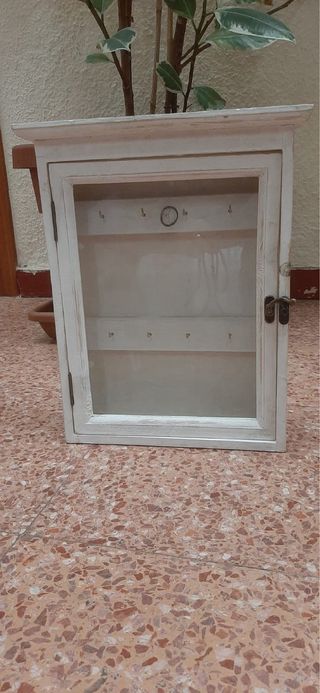 Este joyero de estilo rústico es perfecto para organizar tus accesorios. - Diseño con puerta de cristal. - Acabado en blanco envejecido. - Incluye ganchos para colgar joyas. Todo lo que se venda en este perfil, será destinado a proyectos solidarios relacionados con la integridad y el cuidado de niños.