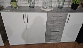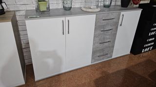 Mueble aparador con un diseño moderno y funcional. - Tres puertas de acceso. - Cuatro cajones. - Combinación de acabados en gris y blanco. ✅ 3 años de garantía 💳 Financiación disponible 📦 Pago contra reembolso 🚚 Envío a tu localidad (consulta tarifas) 📲 Whatsapp: 661*226*979 ✨JULIETH✨