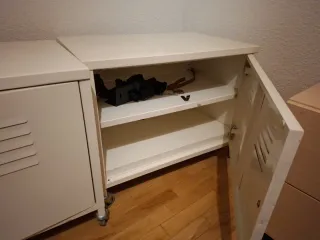 Mueble de almacenamiento IKEA en color blanco, ideal para organizar cualquier espacio. - Diseño modular con compartimentos. - Incluye puertas y cajones para guardar objetos. - Tiradores con forma de estrella. A uno de ellos le falta la pieza metálica.