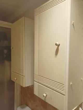 Conjunto de muebles de baño con un diseño elegante. Ver fotos tiene soporte para poner baldas entre ellos si se desea. - Acabado en madera, una puerta con una balda interior cada uno y un cajón en la parte inferior de ambos.