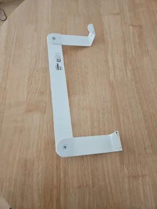 Barrera de seguridad blanca, ideal para mantener espacios seguros. Estructura de metal. Va anclada a la pared (ver última foto). Ancho: 145 cm. Se puede poner recta, pero se puede doblar una parte también.