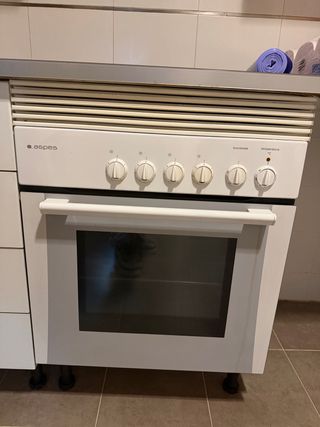 Horno de cocina Teka en color blanco. Funciona perfectamente. Tiene un poco de desgaste la puerta al abrir y cerrar, pero cierra y abre bien. Los botones están amarilleados (se me olvidó apagar el horno). Lleva rejilla y bandeja. Todo limpio. - Diseño moderno y funcional. - Panel de control con mandos. - Puerta con ventana. - Rejilla frontal inferior.