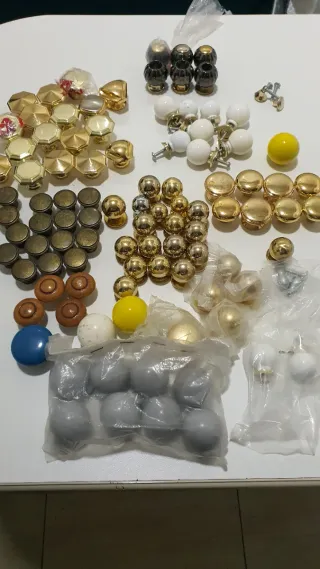 Lote variado de pomos y tiradores para dar un nuevo aire a tus muebles. Ver y probar sin compromiso. Alfonso 639541044 Se venden por separado o lotes. Precio por unidad. - Pomos dorados de diferentes diseños (hexagonales, redondos). - Tiradores blancos y amarillos. - Pomos de madera y azules. - Pomos plateados y oscuros. - Incluye tornillería para su instalación.
