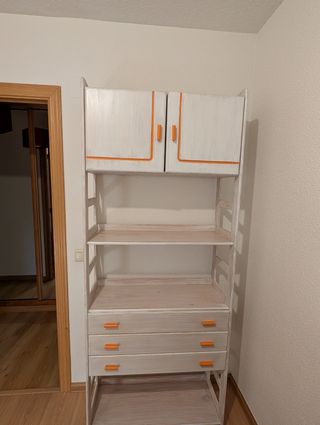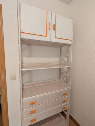 Estantería de madera maciza pintada a la tiza. En tono blanco con detalles en naranja. Diseño moderno y funcional. Varias valdas, un armarito con dos puertas y tres cajoneras. A juego con la cama nido Si te compran las dos cosas hago descuento.