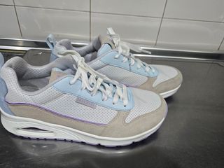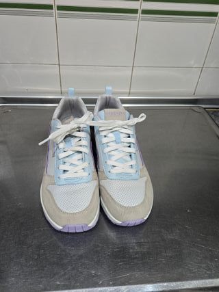 Zapatillas deportivas Skechers para mujer. - Diseño moderno en tonos azules y morados. - Cierre con cordones blancos. - Detalle de perforaciones en la puntera. Numero 39. Poco uso. Estan en muy buen estado. Se entregan con su caja. Se entregan en Puerta del Sur Alcorcon. Envios por wallapop