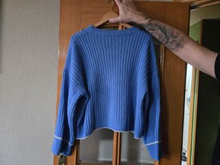 Jersey de punto de manga larga en color azul. Presenta un diseño de canalé vertical y detalles de hilo blanco en los puños y el bajo. 100% acrilico. Medidas: de axila a axila 64 cm y 53 cm de largo. Esta en buen estado. Se entrega en Puerta del Sur Alcorcon. Envios por wallapop. - Tejido de punto acanalado. - Diseño de cuello redondo. - Puños y bajo con detalle de hilo.