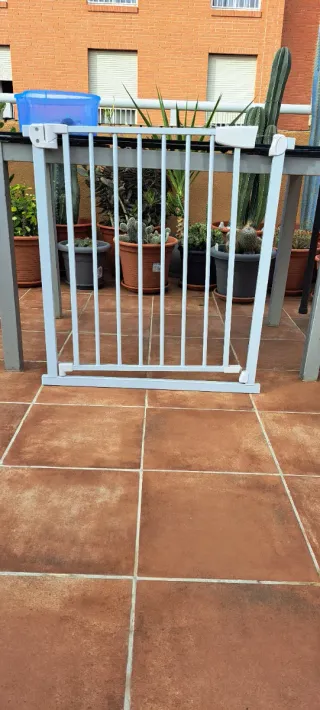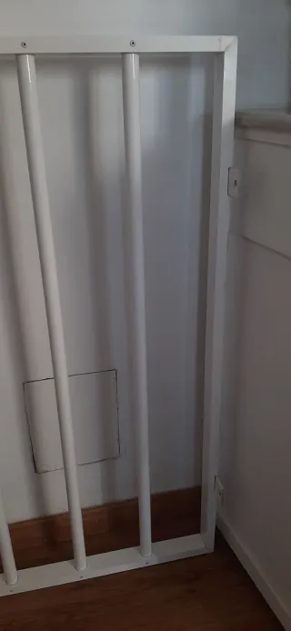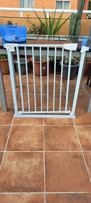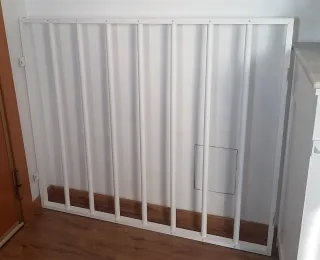 Puerta de seguridad metálica blanca, ideal para proteger escaleras o accesos. - Barras verticales de seguridad. - Mecanismo de cierre. - Marco resistente,en buen estado y precio negociable