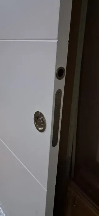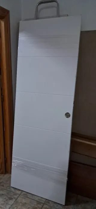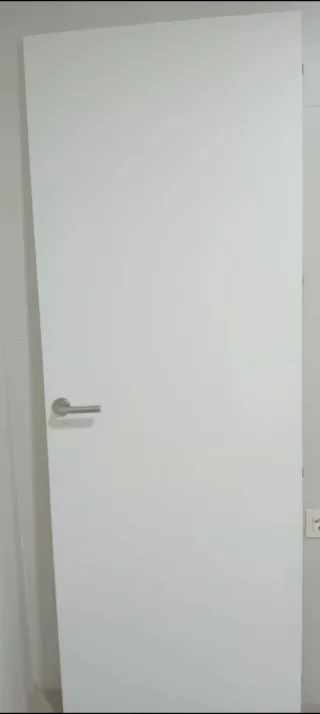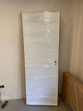 Puerta de interior de color blanco, lista para ser instalada. Es bastante gorda y pesada, parece como de oficina o como si fuera puerta de cochera. TENGO 2 MAS APARTE (en una pone privado y en otra sala de reuniones). Medidas: 2 m de alto, 80 cm de ancho, 4 cm profundidad - Acabado liso. - Manilla negra incluida. - Diseño moderno.