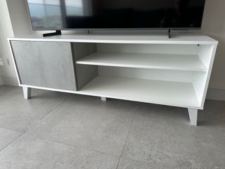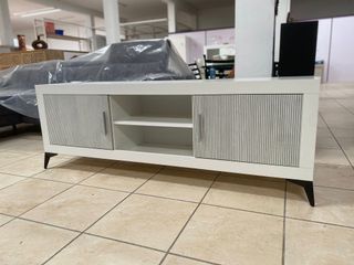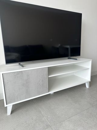 Mueble de televisión moderno con un diseño elegante. - Acabado en blanco y gris. - Puerta corredera con textura de piedra. - Patas cónicas blancas.