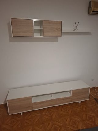 Conjunto de muebles para salón, ideal para tu televisor. Combina un diseño moderno con acabados en blanco y madera efecto roble. - Mueble bajo de gran longitud con compartimentos abiertos y puertas. Medidas: 200 ancho x 46 alto x 40 fondo - Mueble superior colgante con puertas correderas y estantes interiores. Medidas: 107 ancho x 40 alto x 30 fondo Se vende junto no por separado. NO INCLUYE ESTANTE BLANCO PEQUEÑO