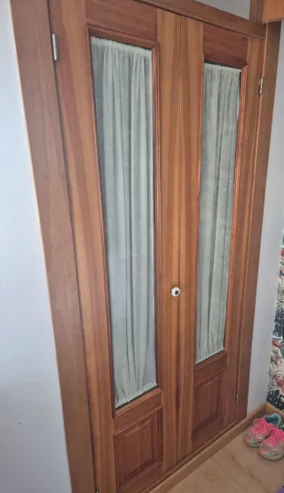 Se venden puertas de armario de madera con un diseño clásico y elegante. - Fabricadas en madera de alta calidad. - Incluyen tiradores redondos blancos. - Dos puertas con cristal y cortinillas interiores. Medidas 1,80 cm alto y 0,40 cm de ancho. Las pequeñas 0,40cm por 0,40 cm Serían 4 puertas grande y 4 pequeñas. Sen incluye los tapas juntas