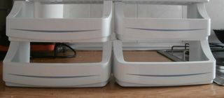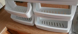 Conjunto de cuatro accesorios, estantes o lejas para la puerta de frigorífico. Estos estantes son de plástico blanco con un diseño de líneas azules. Son de un blue sky, compatibles con otros modelos. medidas: 24,5x10 centímetros PRECIO POR UNIDAD: 3 EUROS, LOTE COMPLETO DE LOS 4 ESTANTES: 10 EUROS. - Fabricados en plástico blanco. - Diseño con líneas azules decorativas. - Ideales para organizar la puerta del frigorífico.