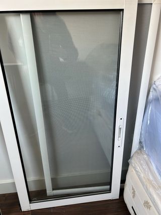 Puerta corredera de paso. - Marco de aluminio blanco. - Panel de cristal. - Medidas 125x208 cm - Con persiana - Doble cristal y con protección solar - Mosquitero a medida - Venta hasta 22 de marzo