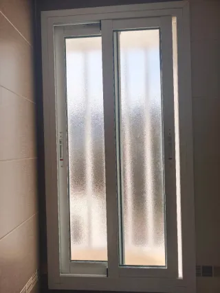 Ventana corredera de aluminio con acabado en blanco y cristal tipo pixelado. Ideal para espacios donde se requiere privacidad. - Marco de aluminio. - Cristal texturizado. Medidas de 1 m de alto x 1,70 m de ancho
